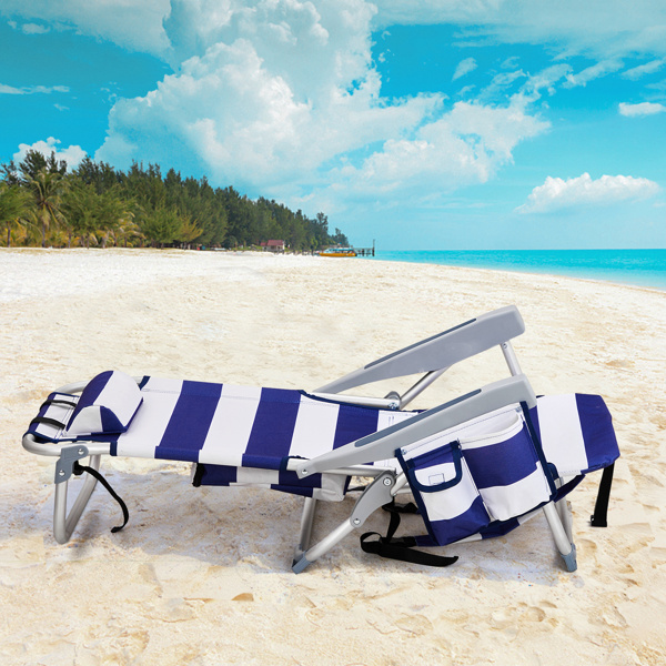 Get comfortable with this Folding beach Chair. It is an ideal solution for sitting and relaxing in comfort during outdoor activities. It is also a must-have for a sporting event, a picnic, a camping trip or even just to the backyard. The aluminum frame is not only light-weight, but also offers even greater sturdiness and stability to make it stand up to various conditions. In addition, the adjustable back with 5 positions to create better sitting feeling, and the extra storage space such as pouches on the back and side cup holder allow you to keeps the necessities right by your side. The beach chair is light-weight and easy to move so that it fits easily inside most vehicles for fast transport wherever you need.