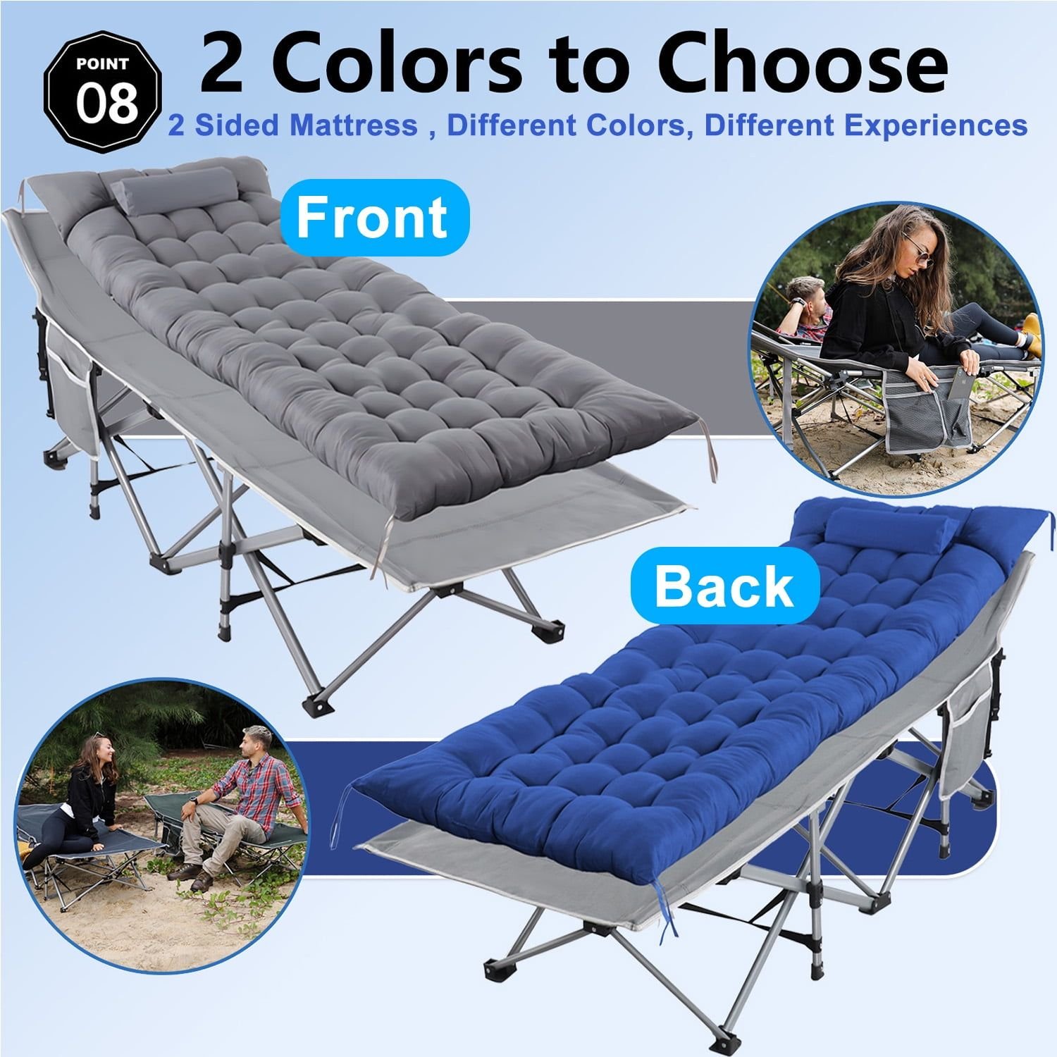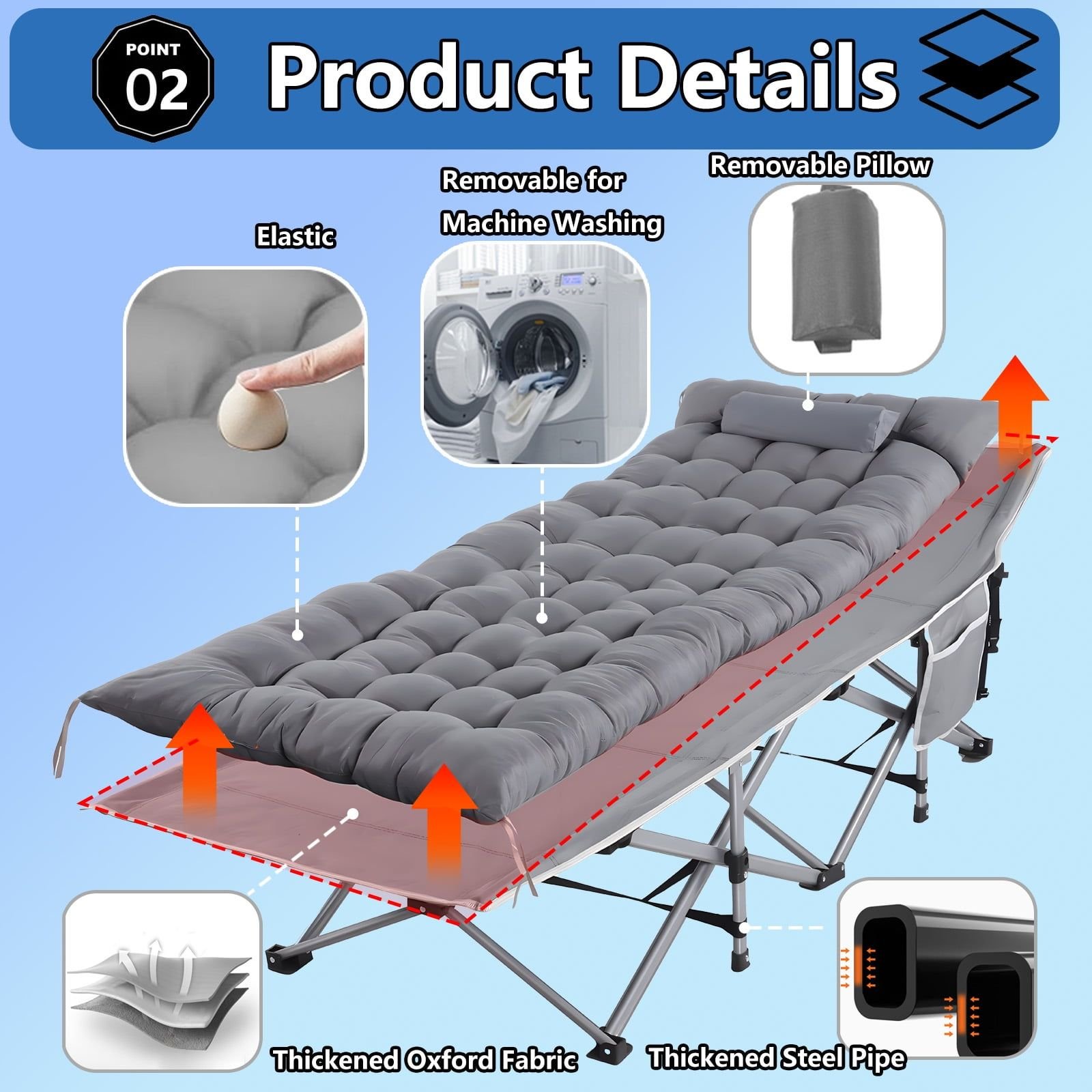 Integrated Comfort: Features an all-in-one design with an attached pillow and a 3-in-1 organizer pocket for essentials like cell phones, keys, and water bottles, enhancing convenience for various outdoor activities.Enhanced Support: Constructed with upgraded tubular iron legs, including 10 thickened oblate square tubes, providing superior stability and a robust 500 lbs carrying capacity, ideal for larger individuals.Comfortable Sleeping: Includes a soft, removable mattress pad for added comfort, which can be removed in warmer weather to increase breathability, ensuring a comfortable sleep experience.Effortless Setup: Designed for quick deployment, this folding cot can be unfolded in seconds and packed into its storage bag in under 10 seconds, requiring no installation.Versatile Application: Suitable for a wide range of uses including camping, hiking, road trips, office breaks, and as an extra bed for guests, making it a highly adaptable portable sleeping solution.Rigorous Quality: Manufactured under strict quality control standards, with each component undergoing extensive testing to ensure optimal performance and durability.