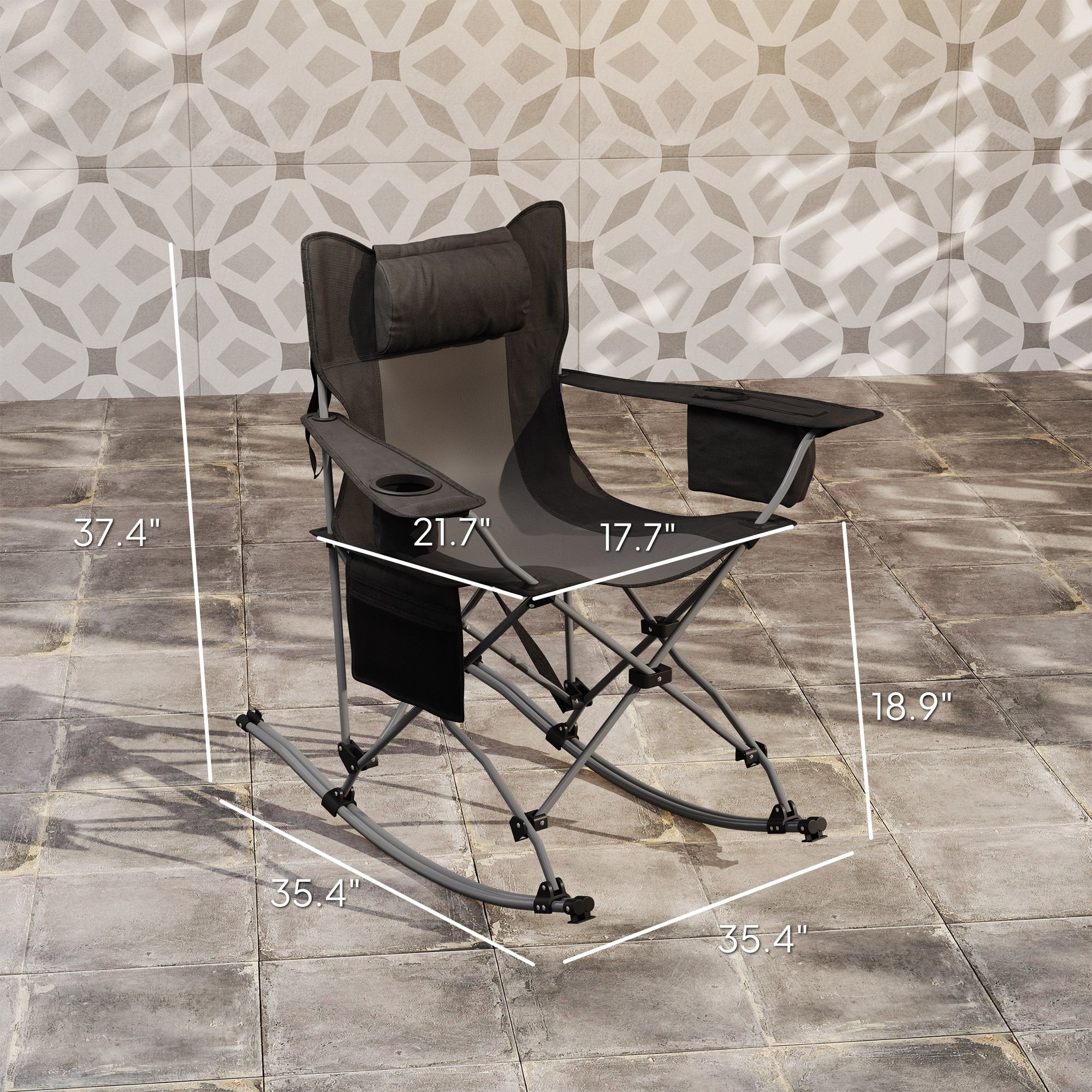Discover the freedom and relaxation of the Outsunny rocking camping chair! The 90° to 168° range of motion lets you comfortably sway back and forth, while the breathable mesh and padded headrest keep you cool and comfortable. Featuring a convenient side pocket, cup holder, and cooler bag, this folding chair is ready to go for any outdoor retreat. Easy to transport and store, it's a must-have for every camping trip.