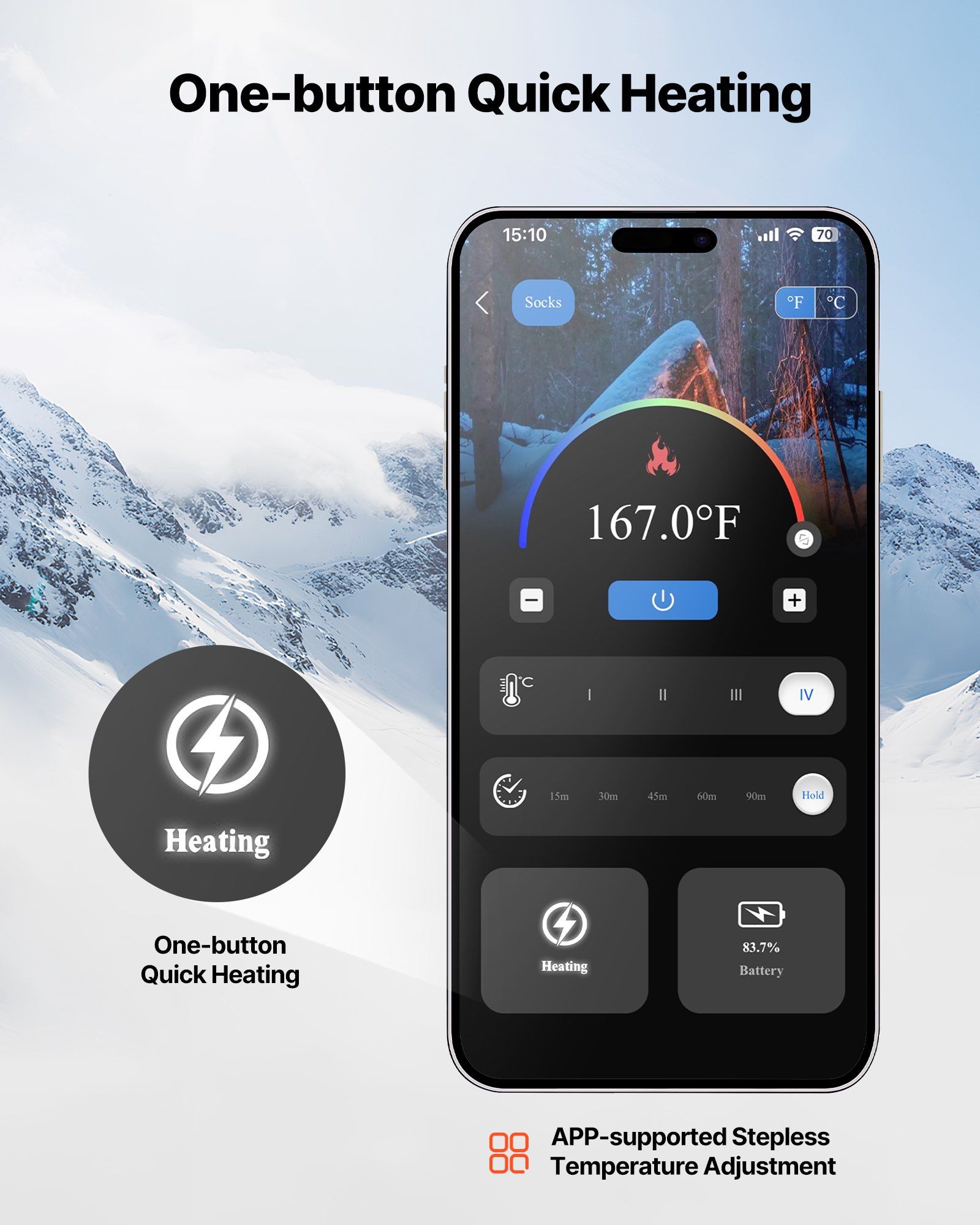 1.Four-Temperature Control: Switch between four heat levels of our battery operated socks from 40Celsius to 70Celsius. Adjust with the physical button or app, making it easy even with gloves on, so you stay comfy without worrying about too much or too little heat
